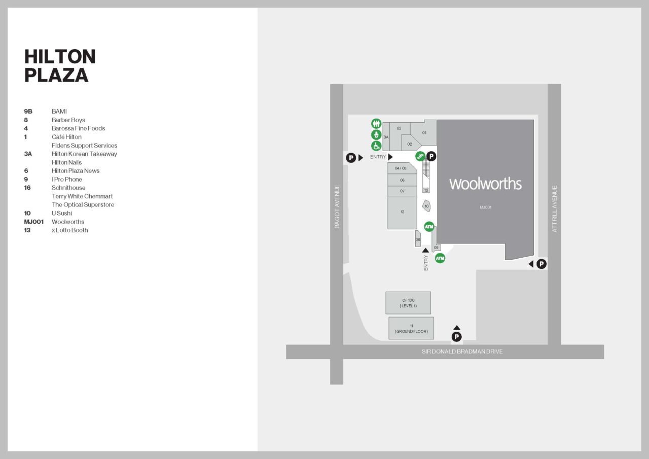 Centre Plan List View Map View Ground Level Stores 9B. BAMI 3A. Hilton Korean Takeaway Terry White Chemmart 8. Barber Boys Hilton Nails The Optical Superstore 4. Barossa Fine Foods 6. Hilton Plaza News 10. U Sushi 1. Café Hilton 9. I Pro Phone MJ001. Woolworths Fidens Support Services 16. Schnithouse 13. X Lotto Booth Click here to download PDF floorplan